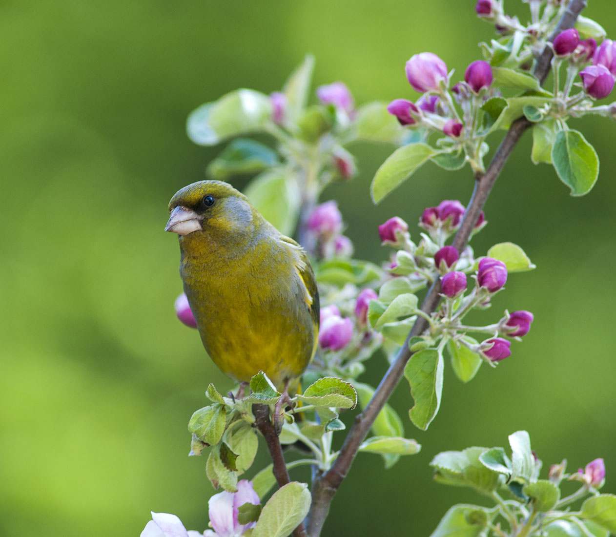 Grønirisk i blomstrende æbletræ. (Chloris chloris).