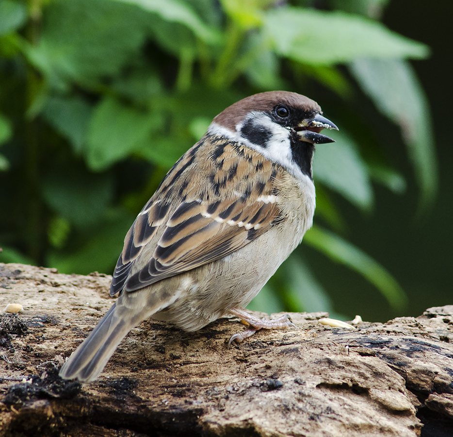 Skovspurv ved foderautomat i hul træstamme