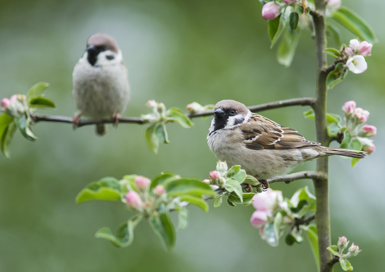 Skovspurv i blomstrende æbletræ